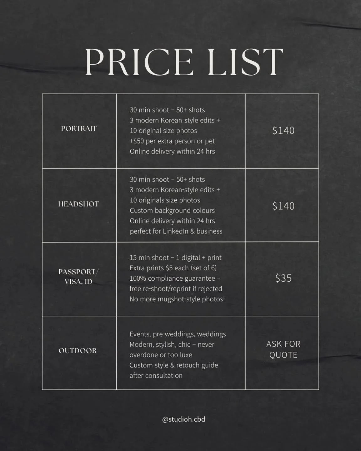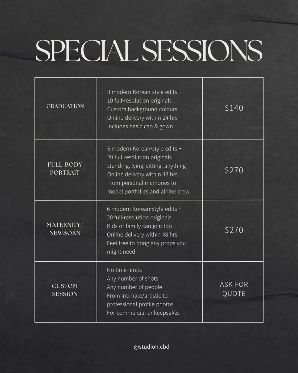 (Indoor sessions are held at our own studio — no rental fee required.)Tag us on Instagram (@studioh.cbd) to receive 1 extra retouched photo for free.